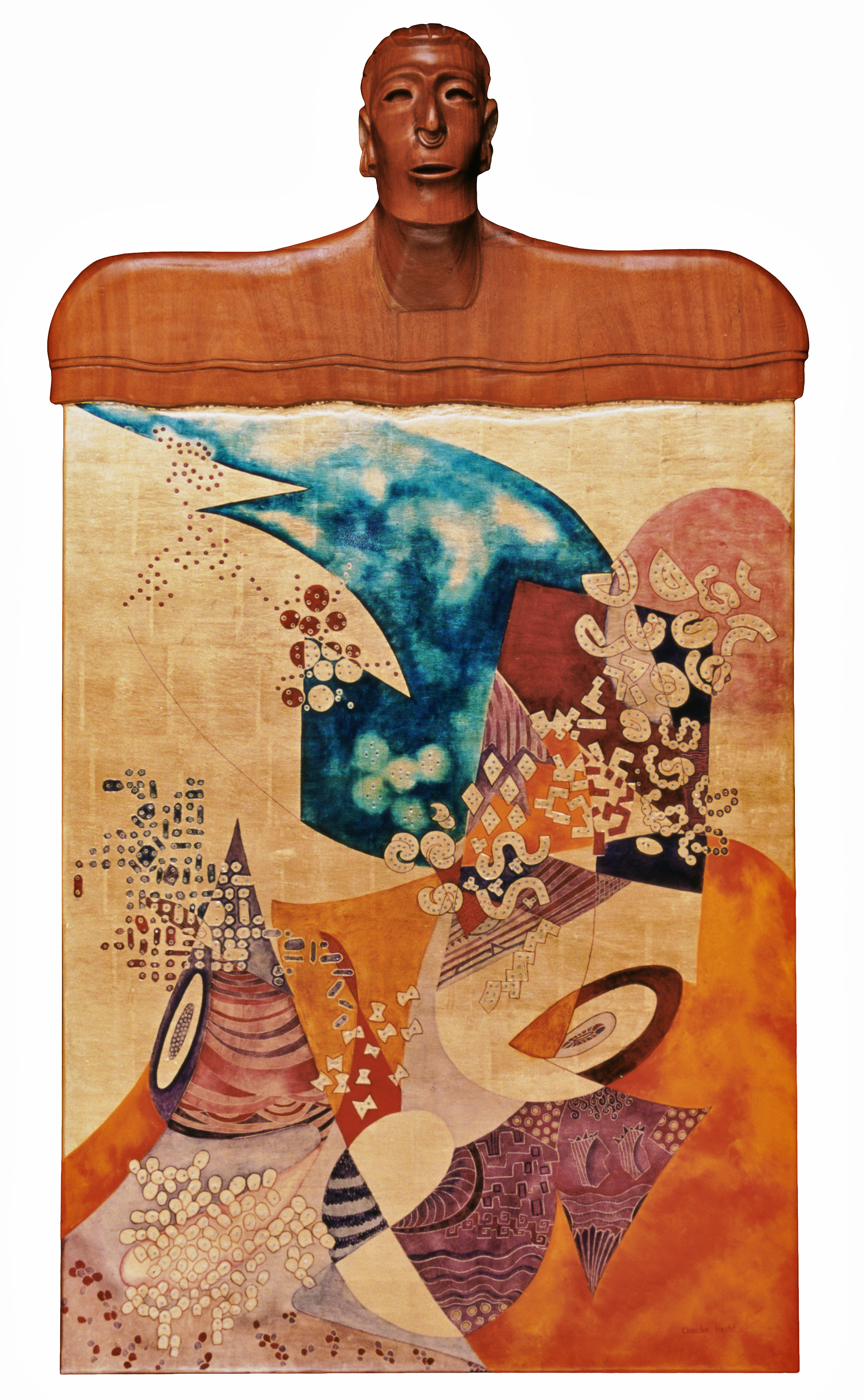 “ANCESTRAL PHILOSOPHY” Wood sculpture, 23K gold leaf, oil, canvas & wood panel 2003 H 147cm x W 82.5cm H 58” x W 32 ½”