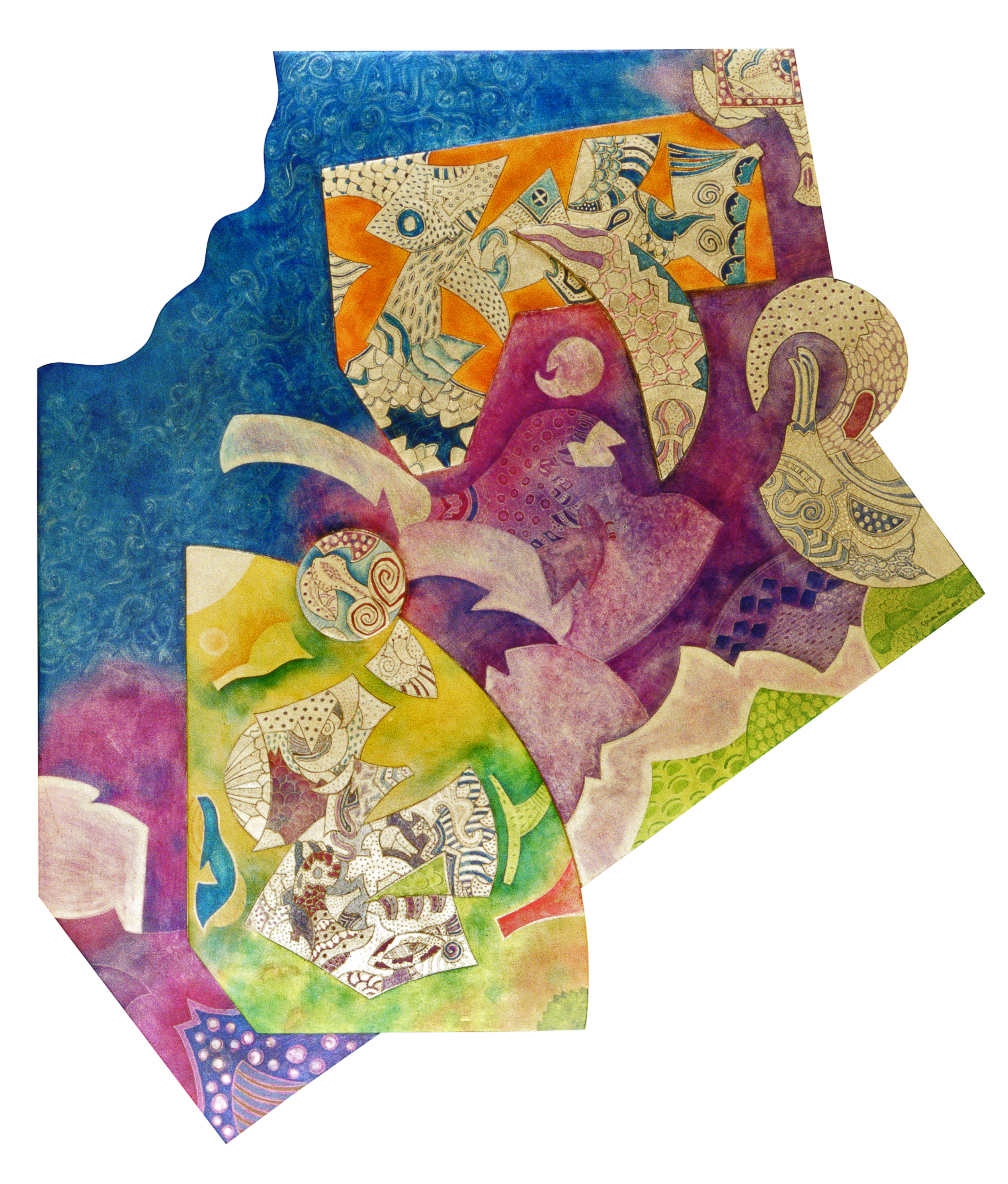 “UNIVERSAL HARMONY” Oil on metal leaf, over Gesso & canvas covered wood panel 2002 H 113cm x W 155cm H 44 ½” x W 61” Multiform collage; acquire different shades depending on the angle at which they are looked at.