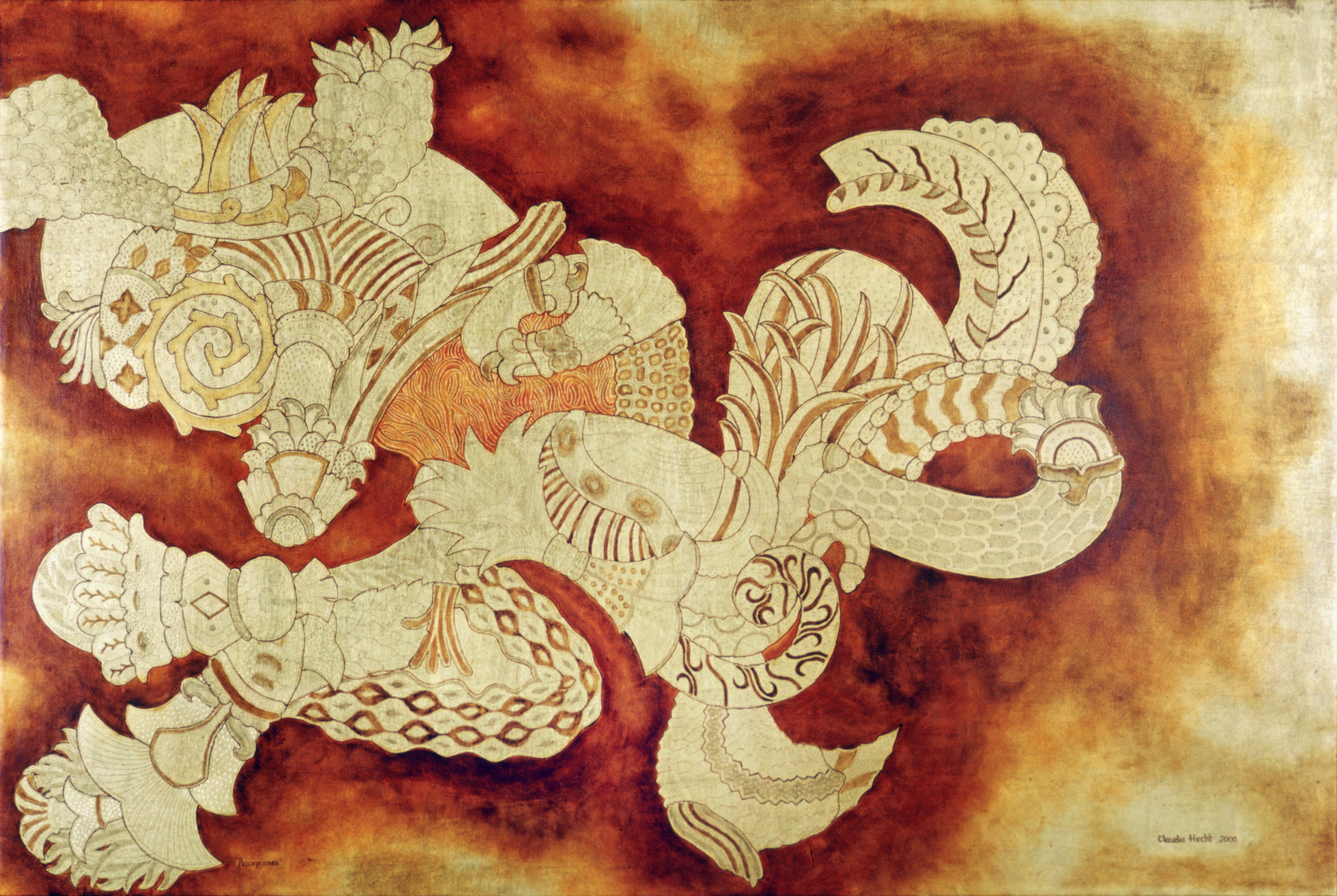 “PERCEPTIONS” Oil on metal leaf, over Gesso & canvas covered wood panel 2000 H 120cm x W 80cm H 47” x W 31 ½” Sea of emotions that merge in a destiny! Music that revives the soul silence and its mysteries.
