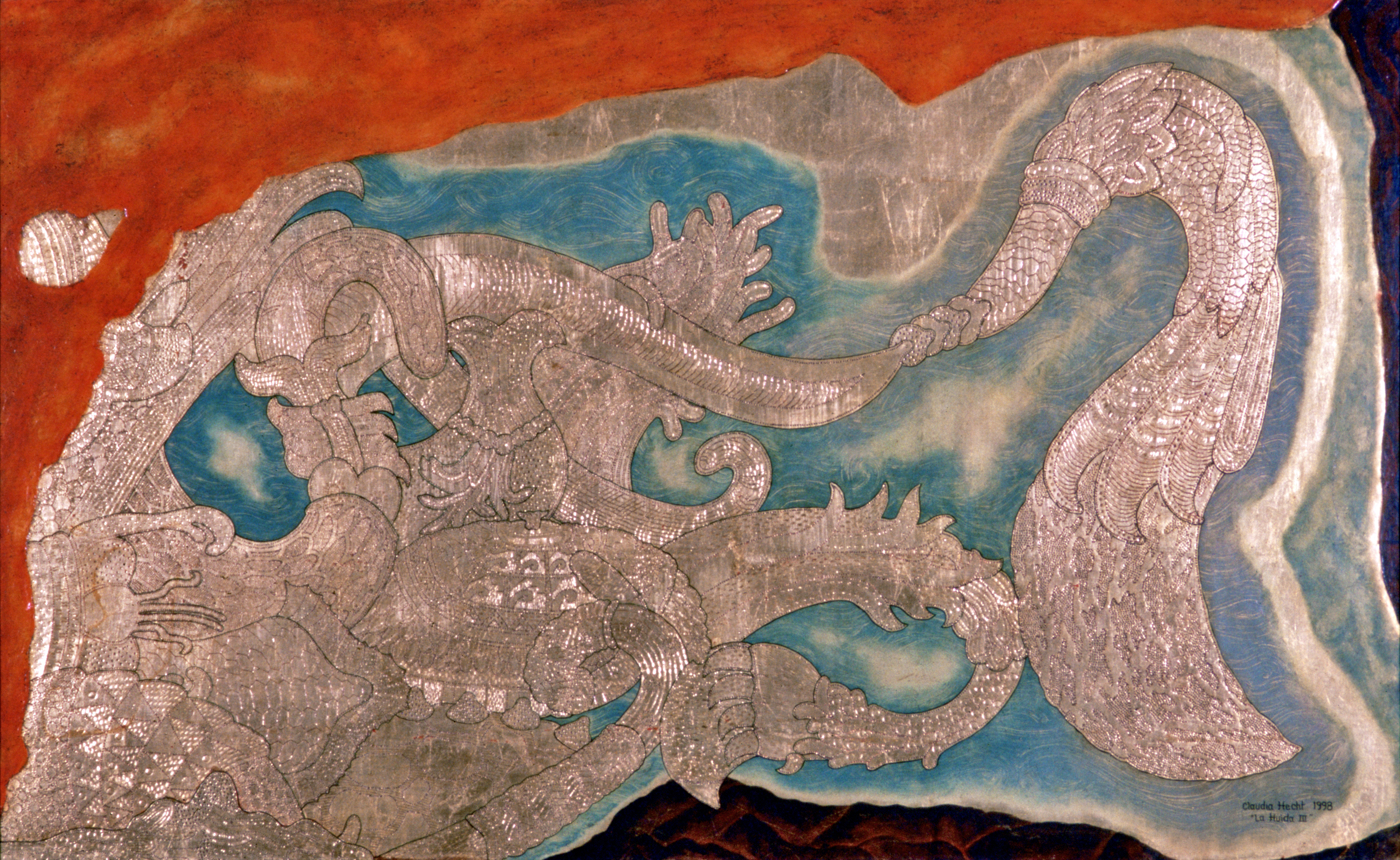 Oil on metal leaf, over Gesso & canvas covered wood panel