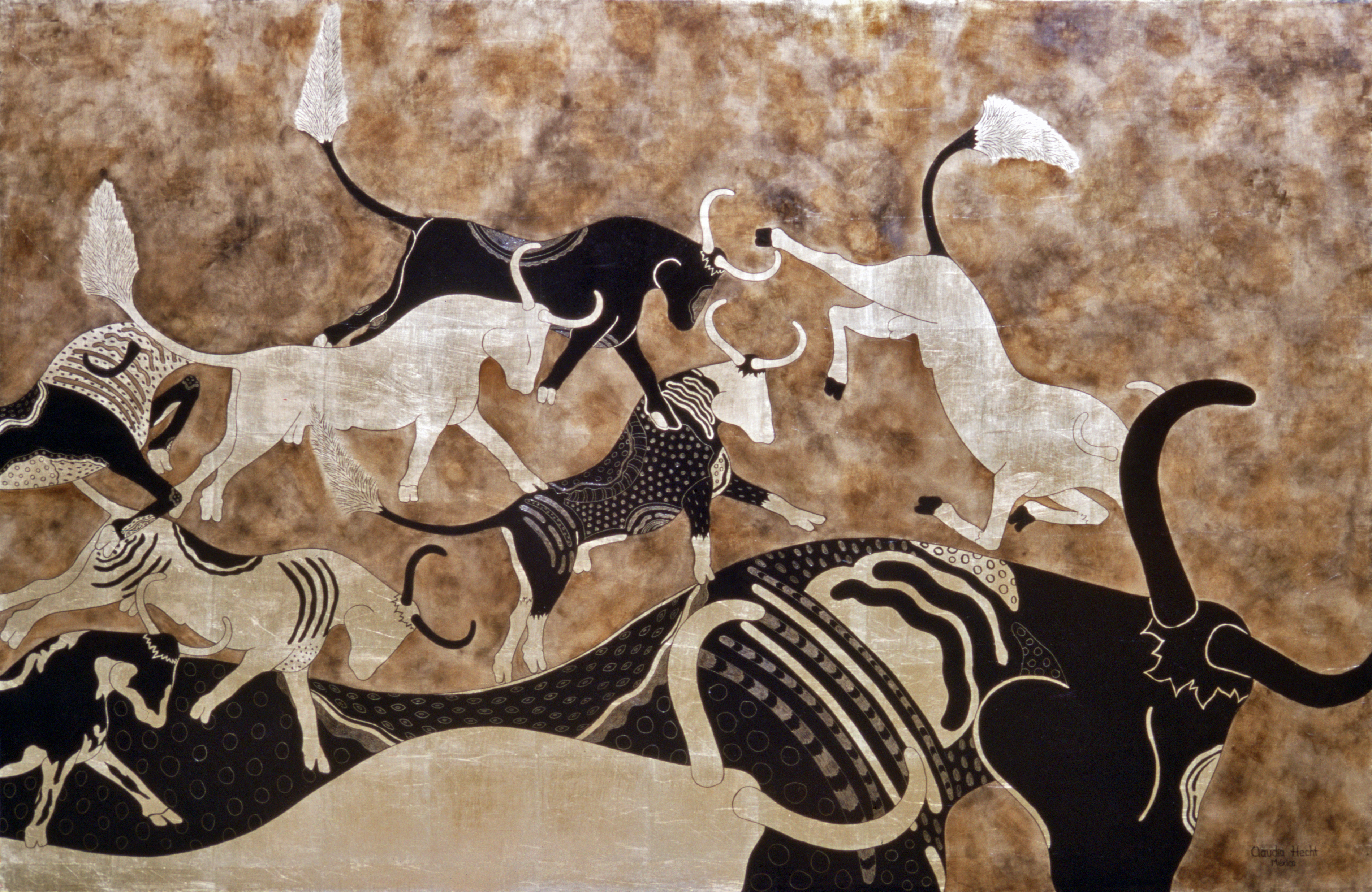 Oleo, hoja de metal, lienzo y panel de madera